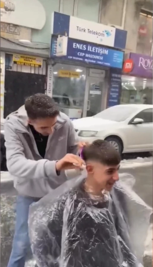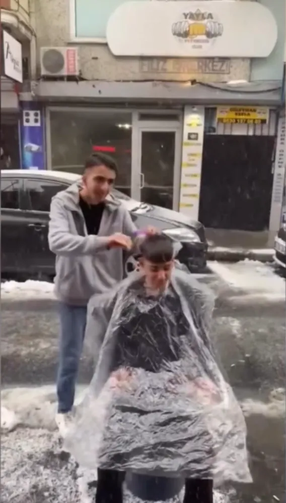 Tıraşın ardından müşterisinin saçına şampuan döken kuaför, karla saçını yıkadı. Taksim'de ise iki kuaför, yaptıkları kardan adama önce saç ekledi ardından tıraş etti.