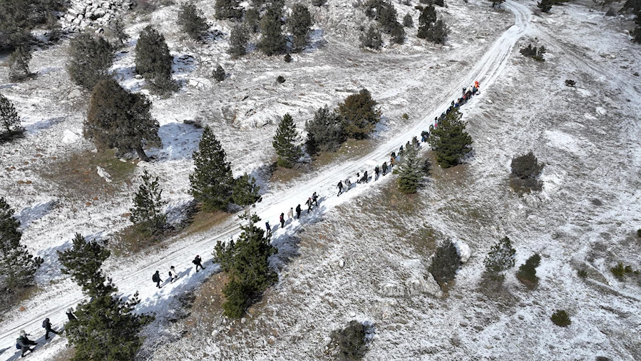 Anamas Dağı'nın Kurucuova Mahallesi eteklerindeki İslibucak Ormanı'nda buluşan doktorlar, 7 kilometrelik parkurda doğa yürüyüşü gerçekleştirdi. Göz doktorları, göz tansiyonu rahatsızlığına dikkat çekmek için kar örtüsü üzerinde yürüdü.
