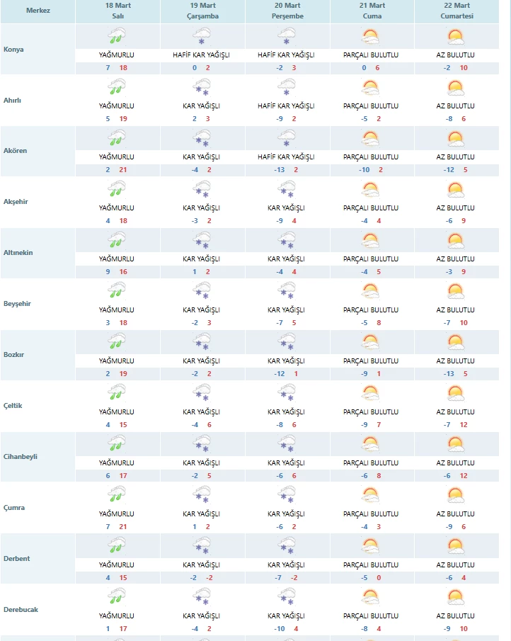 Meteoroloji Genel Müdürlüğü, Konya, Karaman, Aksaray ve Niğde için zirai don uyarısı yaptı. Balkanlar üzerinden gelen soğuk ve yağışlı hava nedeniyle 19 Mart Salı gece yarısından itibaren 22 Mart Cuma sabahına kadar bölgede orta ve kuvvetli şiddette zirai don bekleniyor.