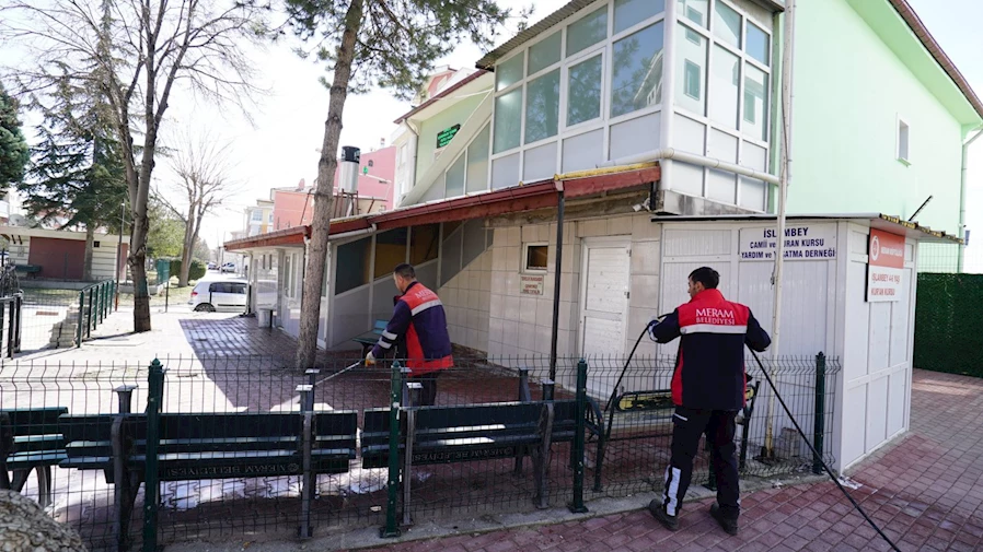 Meram Belediyesi, mübarek Ramazan ayı dolayısıyla ilçe genelindeki camilerin bahçelerinde kapsamlı bir temizlik çalışması gerçekleştiriyor. Çevre Koruma ve Kontrol Müdürlüğü ekipleri tarafından yürütülen çalışmalar kapsamında cami, türbe ve mescitlerin bahçeleri yıkanıyor, avlularının ve çevrelerinin temizliği titizlikle yapılıyor.